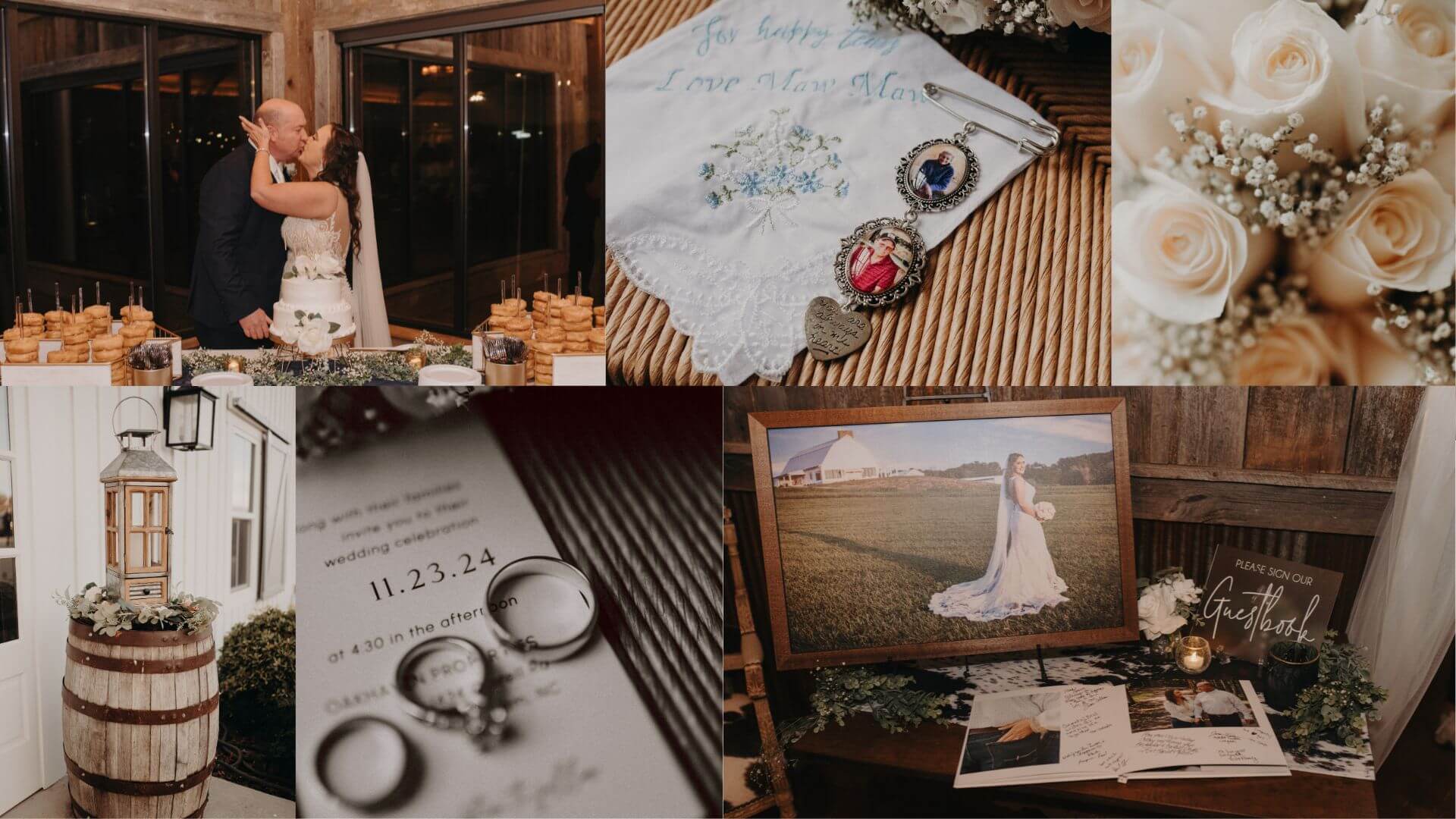 Our November bride designed a beautifully simple white rose bouquet with baby’s breath that was also reflected in the bridesmaids’ florals and the groom’s boutonniere. Roses and baby’s breath were also part of the cake decor and guestbook table.