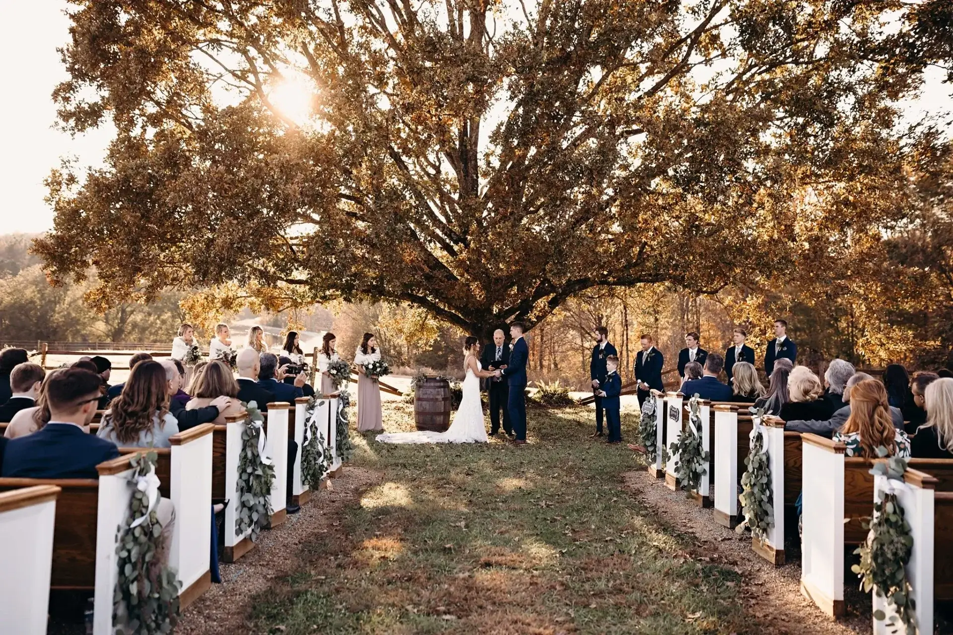 At Oakhaven, you’ll find three stunning outdoor wedding locations, each offering a distinct backdrop with the season. Spring is always a celebration of green rolling hills, flowering trees, and a variety of blooms. Fall is captured in spectacular fashion in front of Oakhaven’s Signature Oak. But no matter the season, the following tips will help ensure ceremony planning ease.